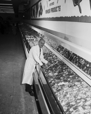 Series opening of new Buddie's Super Market Number 3, 6825 Camp Bowie. Carl Groschup, manager of the meat market department of the new Buddie's Super Marke, exhibits some of the meat to stock the refrigerated compartments at the store.