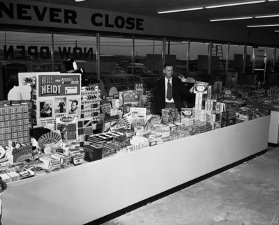Series opening of new Buddie's Super Market Number 3, 6825 Camp Bowie. Elton Simms, manager of the drugs and notions department of Buddie's Super Market Number 3 at 6825 Camp Bowie, stands behind one of the many counters of the store devoted to drugs and notions.