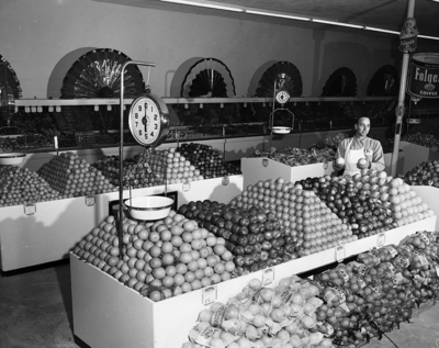 Series opening of new Buddie's Super Market Number 3, 6825 Camp Bowie. Bill Dolgener, manager of the produce department, arranges fresh fruit.