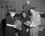Left to right, Mrs. Elsie Lasker, Miss Elizabeth Boone, and Clyde Smith. Mrs. Lasker, board member of the Lighthouse for the Blind, passes out gifts, members of the Lighthouse social club.
