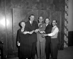 Five members of the Fort Worth National Bank family received wrist watches at the bank's annual Christmas party to commemorate joining the Quarter Century club. Left to right, Mrs. Bess P. Smith, W. J. Shroeder, F. L. Carlson, Maurice Singleton, and Louis J. Wright.