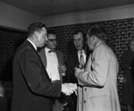 Meeting at the Country Circulation Christmas party are Leo Pickle, East Texas traveling representative, and Ross Ladd, distributor at Mineral Wells. Looking on with the satisfied look is J. C. Pool, while James Gill of Arlington seems a little dubious.