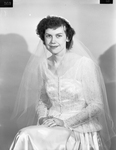Mrs. B. B. Stevens is wearing a laced long sleeved blouse over a silk gown and a veil.