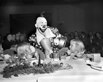 Second only to Santa Claus at the All Church Home party given by the Lions Club was Paul Jung, world-famous clown, flanked by Linda Gail Adams, 4, left, and Rita Lemmer, 4.