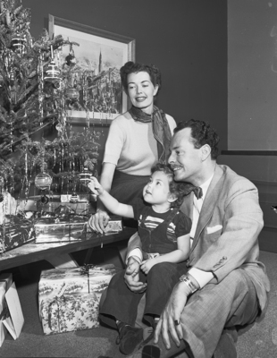 Webb Tilton, star of "South Pacific" with Mrs. Tilton and daughter, Deborah relaxing next to the Christmas tree and gifts.