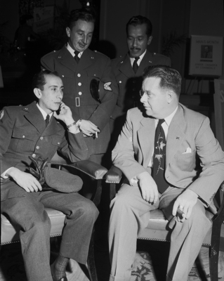 Colombians gathered in Hotel Texas with other foreign visitors for a Christmas party given by Bell Aircraft Corporation. Left to right, back row, Lieutenants Carlos Trujillo and Carlos Brand. Front Row, Lieutenant Marco Gil and Ray Myers.