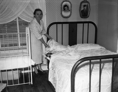 Mrs. Jewel Caraway, wife of Mr. Bryant Caraway, shows some of the work which made her winner in a community bedroom improvement contest at Tin Top. Published in the morning edition, April 16, 1950.