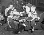 Santa Claus, in the person of Rev. Raymond Wewars, hands outs gifts to, left to right, Patricia Cushing, Mary Ann Martinez, Alex Aucoin. With them are Peter Galier, left, and James Burkhart