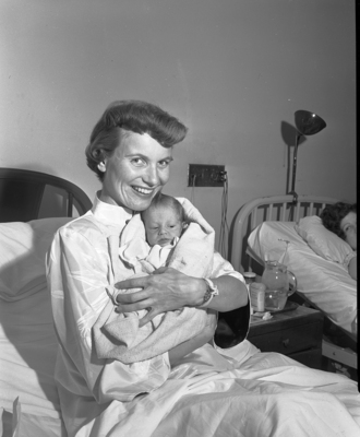 Mrs. Robert Richards cuddles her newborn baby, Robin, at the hospital.