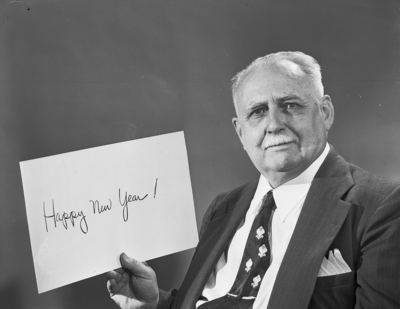 William Goetz, handwriting expert, bust shot. Goetz is holding up a paper with "Happy New Year!" written on it.