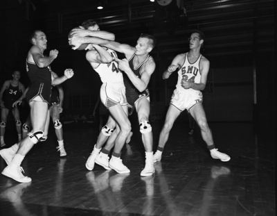 The Aggies' Bill Williams gets a hand on the ball to stop action in the Southwest Conference basket ball meet Saturday night at Dallas. Trying to pass is Southern Methodist's Ernest Proud. At right is Bob Clayton (#24) of SMU. The Ponies won, 57-35.