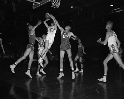 Don Dickson (#11), 6-foot 8-inch Baylor center, stretches out to defend against Texas' George Scaling (#20) in pre-season SWC tournament at Dallas Friday night. Baylor's John Starkey, 6 feet 7 inches, misses with graceful swipe at left as Texas' Billy Powell (#30) lifts protective elbow. Baylor won.