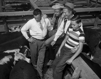 Image shows three men and a boy inspecting cattle at the Fort Worth Stock Yards. From left to right, Earl Knebel, Hamilton High School vocational agriculture teacher; Leon Watson, Future Farmers of America (FFA) boy; County Agent E. R. Lawrence and Grady Roy Baker, member of the Shive 4-H Club. Published in the Fort Worth Star-Telegram morning edition, April 12, 1950.