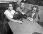 Guests at the West Side Lions Club annual party for blind children inspected exhibits at the Children's Museum before the party in the Playhouse. Inspecting a stuffed crow, left to right, are Marie Teague, Randell Whitfield, and Terry Jo Davis.