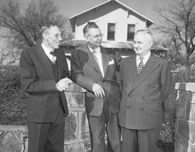 R. B. Anderson, center, chats with two uncles, A. W. Haskew, left, of Burleson, and Dr. W. L. Anderson, right, Fort Worth dentist, during a visit to Godley.