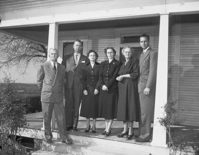 R. B. Anderson, second from left, who became Secretary of the navy, poses on the porch of the family home at Godley with, left to right, his father, R. L. Anderson; sister, Mrs. Ruth Smith, a Fort Worth school teacher; sister, Mrs. Velma Pickens, Greenville school teacher; mother, and brother Ray Anderson of Fort Worth. Another brother, Wayne Anderson of Arlington, is not shown.