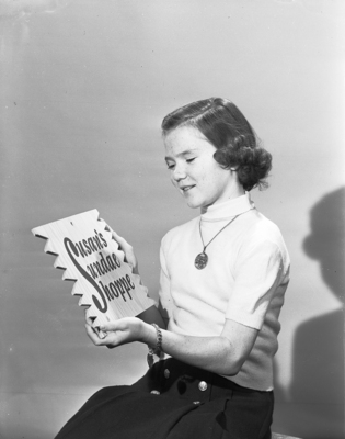 Susan Ziegler with sign for her party which reads "Susan's sundae shoppe."