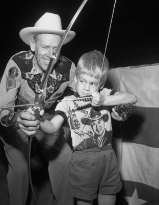Image shows Jeff Jarvis, 5, gets the feel of a bow and arrow under the watchful eyes of Jim Lynch, archery marksman and a star of the show. Jeff was one of five children who attended the show from the City-County Hospital polio recovery ward. Published in Fort Worth Star-Telegram morning edition April 12, 1950.