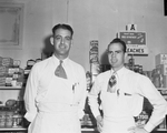 Johnny Lemond, left, and Grady Gandee, employees of A. L. Davis food store wearing their aprons and standing in the cleaning products aisle.