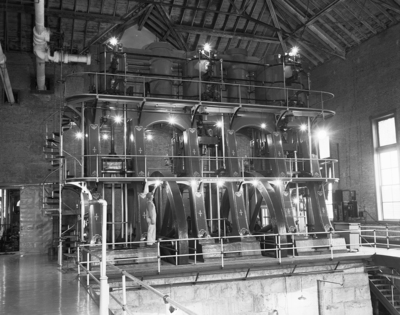 The giant old steam pump at left will be removed from Holly Pumping Plant and be replaced by modern electric equipment shown being checked by J. B. Haynes
