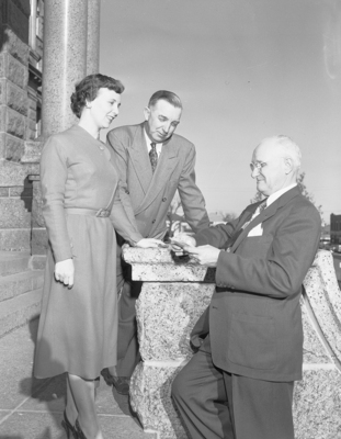 Three re-elected officers who have taken their new oaths paused on the courthouse steps. Left to right are Mrs. Lewis Wall, district clerk; Reed Stewart, tax assessor-collector; and Mel Faulk, county clerk.