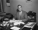 V. M. Monticue, financial secretary of the First Methodist Church is shown at his desk working on ledgers and finances.