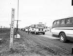 A line of buses on the road next to a mile marker "Dallas 18 miles, Dallas County"