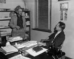 Texas county agents have wide and varied duties. Typical of the agents is Ollie Liner, agent at Plainview, right, shown in his office talking with C. L. Rich, Hale County farmer.