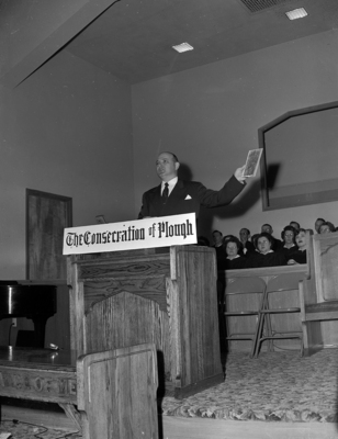 Reverend C. A. Kennedy, pastor of the First Baptist Church of Abernathy, is shown here on the Sunday of reckoning for the church's Lord's Acre plan. At the pulpit, he holds aloft a picture of a filled cotton yard portraying the area's bountiful harvest.