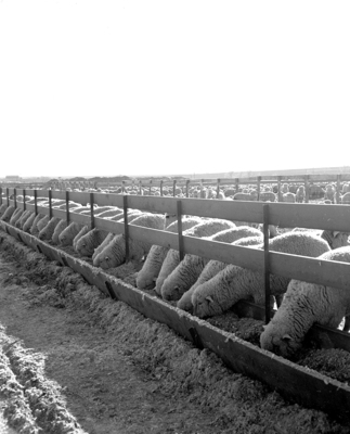 Sheep in the Andy Taylor feedlots at Plainview go after a ration that has cotton burs as a principal ingredient. Lint from the burs shows up in the trough.