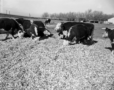Many head of West Texas cattle are feeding on cotton burrs these days. Herefords on the Bruce Gentry farm near Lubbock wasted no time going for burrs that were supplemented with alfalfa hay.