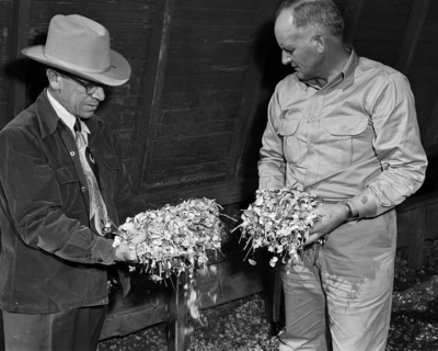 Lubbock County Agent David W. Sherrill, left, and Glenn Hackney, Lubbock County farmer, look at the burrs Hackney is feeding to young dairy stock on his farm south of Lubbock.