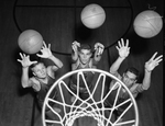 Three big reasons why the Poly five is favored in the city basket ball race are, left to right, Bob Carlson, 6-6, Johnny Betts, 6-5, and Dick O'Neal, 6-6. They help Parrots dominate backboards. The view is looking down from the basketball hoop. The three men are shooting basketballs towards the hoop.
