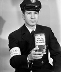 Fireman Lewis Ashley, collector for March of Dimes to benefit people with poliomyelitis. He is shown holding a March of Dimes collection can.