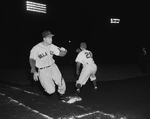 Stu Locklin's face mirrors the stain as he spikes the bag for an infield hit in the fifth inning of the Cat-Indian game's night at La Grave Field. The Oklahoma City outfielder had bunted deep to third and is beating the ball, center, with a stride to spare. The Fort Worth Cat first baseman is Dee Fondy. The Indians won, 4-2, to sweep the short series.