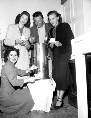 The auxiliary of the River Oaks volunteer fire department raised money to buy a coffee urn for the fire fighters and presented it. Standing, left to right, are Mrs. L. Stephens, vice president of the auxiliary; Leonard Drury, president of the volunteers, and Mrs. Al Ervin, auxiliary secretary. Kneeling is Mrs. B. J. Moore, auxiliary member.