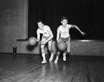 Lettermen Jerry Sims (#14), left, and Gene Pate (#6) are starters for Technical High School basket ball team which faces Poly Friday night, January 9. The boys are dribbling basketballs.