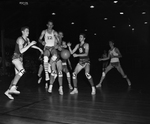 Technical's Jerry Sims (#12) finds himself corralled by Paschal players Friday night, January 9 with the objective of all the loose ball. That's James Matthews (#4), left, Jimmy Bronstad behind Sims and Mike Greenleaf (#8). The Technical Bulldogs upset the Panthers, 54-46, before more than 600 at TCU's Field House.