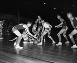 Paschal's Don Simmons, left, reaches while Tech's Paul Mallon (#9), right, seems to be nudging the ball with his foot toward teammate Gene Pate (#6) on floor. Bulldogs' Will Spradling (#5) and Panthers' Mike Greenleaf (#8) attempt to get into the act, too. Tech stunned Paschal, 54-46, in 4A-3 opener at TCU Field House.