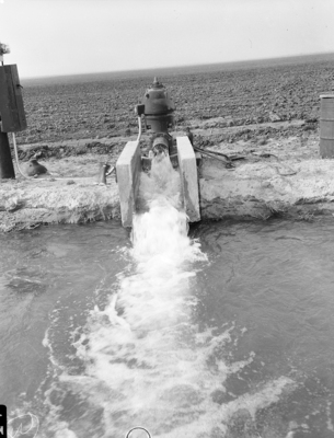 This is one of the irrigation pumps which can produce 1,400 gallons of water per minute on the Hill farm. Published in the Fort Worth Telegram morning edition, May 7, 1950.