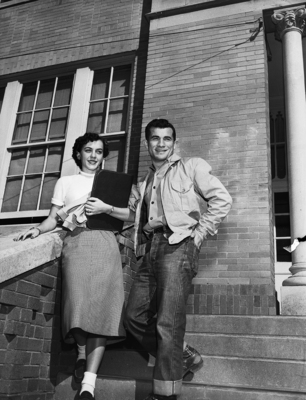 Johnny Thompson, former Italian war orphan who shaped into a typical American youth at Waxahachie. He graduated from high school there and is now faced with going into service and returning to an environment of war. The girl is Mary Beth Crouch, Waxahachie High senior. They are shown standing outside a building.