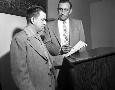 Lloyd Wyatt, left, and T. A. Jean, members of the Fort Worth Amputee Club, check a downtown street map. The club plans to have members on downtown streets January 31st soliciting contributions to the March of Dimes.
