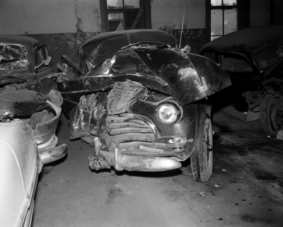 Three people were hurt critically when this car smashes into a tree in the 2200 block of E. 4th Street early Saturday, January 10th. The car with a smashed engine sits in a garage.