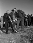 Combining their efforts in groundbreaking ceremonies for Polytechnic Masonic Lodge's new building at Thrall and Avenue G Saturday afternoon, January 10th, are, left to right, Jerry Harwell, oldest living past master; Hibbetts Land, worshipful master, and Harrell C. Ashburn, chairman of the building trustees. The men are breaking ground with one shovel.