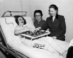 Women of Fort Worth are rallying to help the cause of the Tarrant County Chapter, National Foundation of infantile Paralysis. Visiting patients is one way of helping the cause. Mrs. Robert A. Eirdam has "graduated" from an iron lung to a portable one. Here, Mrs. Knox Hawthorne, center, looks on as Mrs. Leon Stewart, right, plays checkers with Mrs. Eirdam.