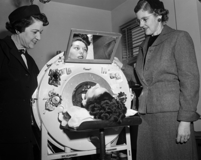 Women of Fort Worth are rallying to help the cause of the Tarrant County Chapter, National Foundation of infantile Paralysis. They visit patients. In an iron lung at City-County Hospital, Mrs. Kenneth Debevoise, flanked by Mrs. Stewart Hellman, left, and Mrs. Mal Rumph, right, shows them pictures of her family posted on the lung door.