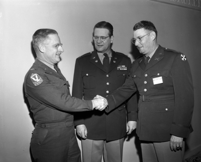 Among Army representatives attending a two-day National Guard logistics conference Monday at Hotel Texas were Colonel F. S. Gillette, left, senior Army instructor, Austin; Lieutenant Colonel E. W. Posse, center, supply section National Guard Bureau, Washington, and Lieutenant Colonel A. Sullivan, right, G-4 section 4th Army Headquarters, Fort Sam Houston, San Antonio. Col. Gillette and Lt. Col. Sullivan are shaking hands as Col. Posse looks on.