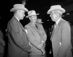 Pondering Cattle Problems - The three cattle raisers on the left can't find the answer to the riddle which has sent cattle prices on a decline. They are W. G. Swenson of Stamford, left; D. Burns of Guthrie, middle, and D. B. Sauls of Hamlin.