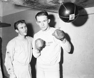 Featherweight Horace Hooper (left) and Welterweight George Carter, they'll fight for Panther Boys Club in regional Golden Gloves. Carter is working on the speed bag punching bag as Hoop looks on.