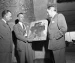 James B. Winn Jr. (center) holds miniature of central mural he is creating for Greater Fort Worth International Airport, with Maury H. Huffman and Joseph R. Pelich, 01/13/1953